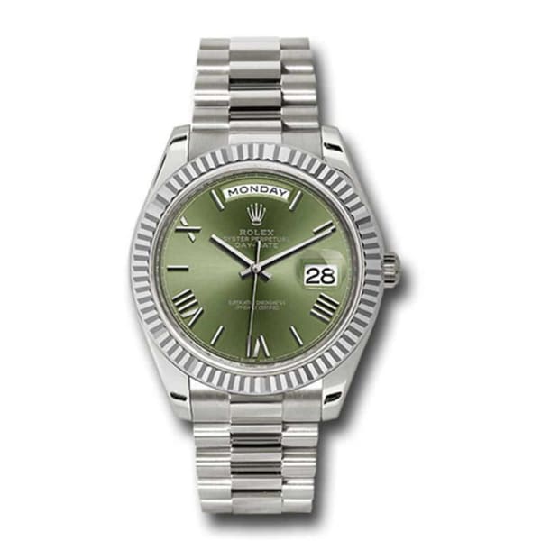 Rolex Day-Date 40 Presidential Olive green dial, Fluted Bezel, President bracelet, White gold Watch