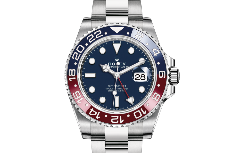 In addition to conventional hour, minute and seconds hands, the GMT-Master II features an arrow-tipped hand, which circles the dial once every 24 hours, as well as a bidirectional rotatable 24-hour graduated bezel.