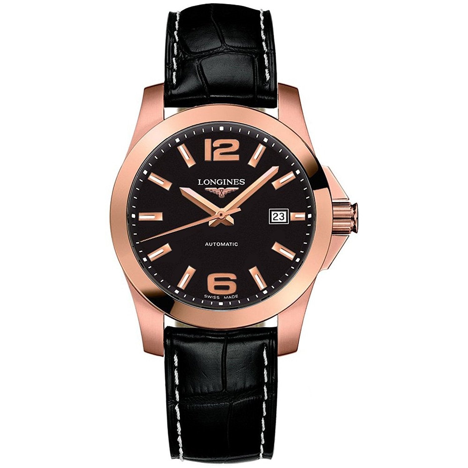Longines Men's L36768563 Conquest 18kt Rose Gold Automatic Black Leather Watch